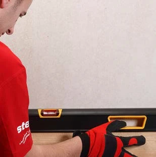 Cel mai bine este să începeți de jos, cu rostul în sus, sprijinind primul rând de plăci pe suprafață. În cazul în care nu există un suport uniform și orizontal pentru dale, montați o șapă de nivelare de referință pe perete, folosind o nivelă de zidar și o riglă pe o înălțime care să nu depășească înălțimea unui singur rând de dale deasupra podelei sau solului.