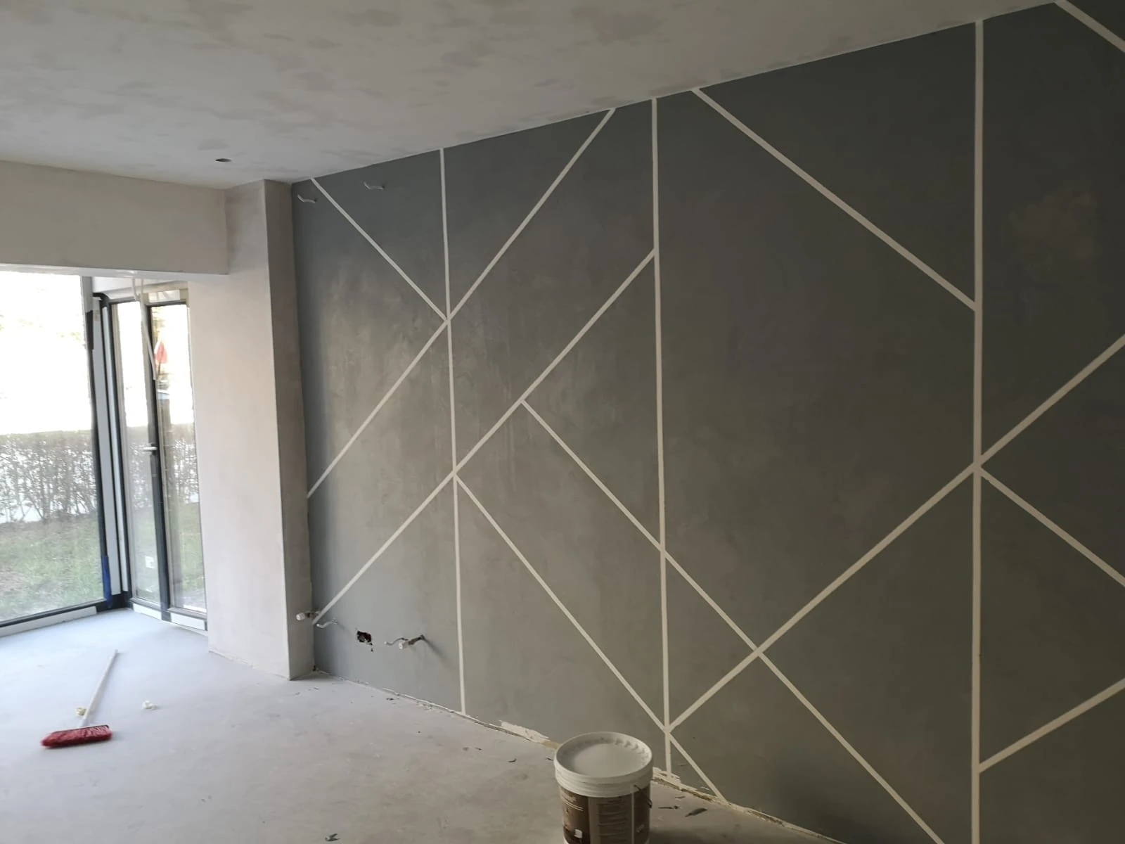 Vopsea decorativa cu efect de beton aparent cu rosturi metalice.